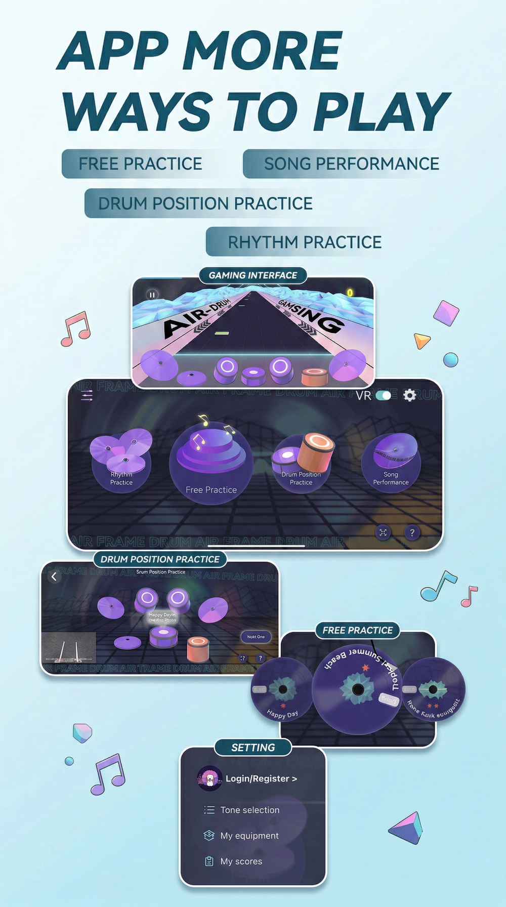 Gamsing App transforms your air drumming into an interactive journey, from rhythm practice to full song performance.
